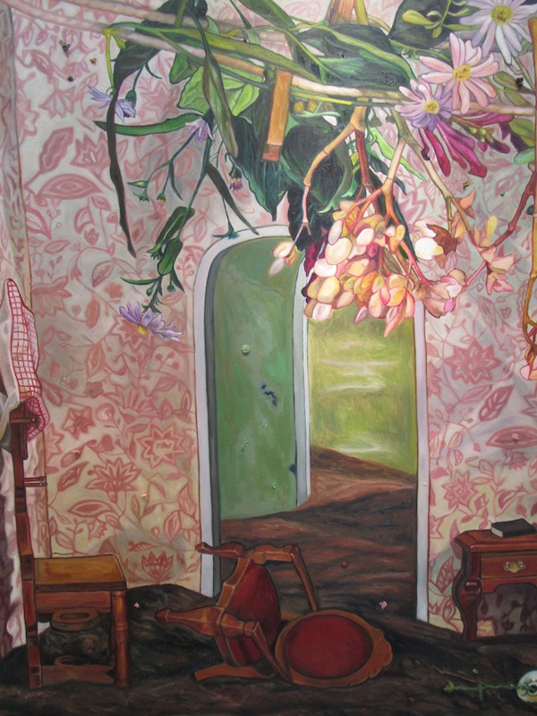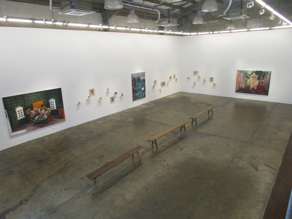 Downstairs Yasmin Sison’s show touched the same concerns. On shelves arrayed around some large paintings were small sculptures made from toys or doll’s house furniture – or things that looked like them. They were quirky. The paintings seemed to be of events in a doll’s house. There was a suggestion both of something staged in a painting like Little Ida’s flowers, a party or a fight? And there was a play on scale – “real-size flowers”. And there were the familiar flicks and drips of paint we see on her work periodically that are there to remind us it is a painting. It was troubled, but in gentle way. Uncanny, but with a smile on its face.